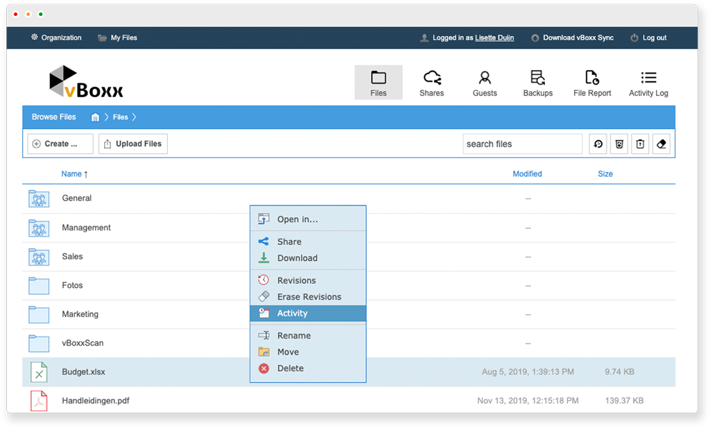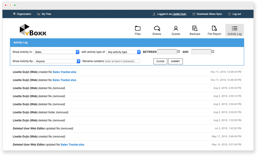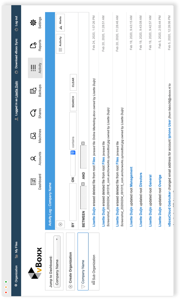 If you have a big organization the amount of activity can be overwhelming. The vBoxxCloud activity log helps you quickly find the right activity.