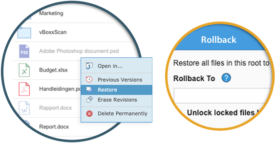 In vBoxxCloud you decide for how long you keep deleted files and old file versions. Go back in time whenever you need to recover deleted files or files that are infected with ransomware.
