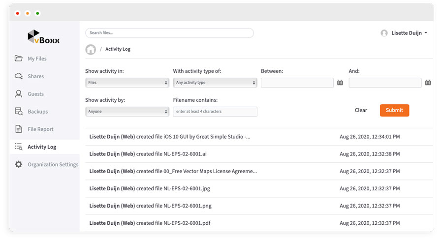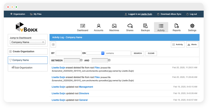 All cloud activity in vBoxxCloud can be directly tracked. As an admin you can easily monitor any changes in vBoxxCloud.