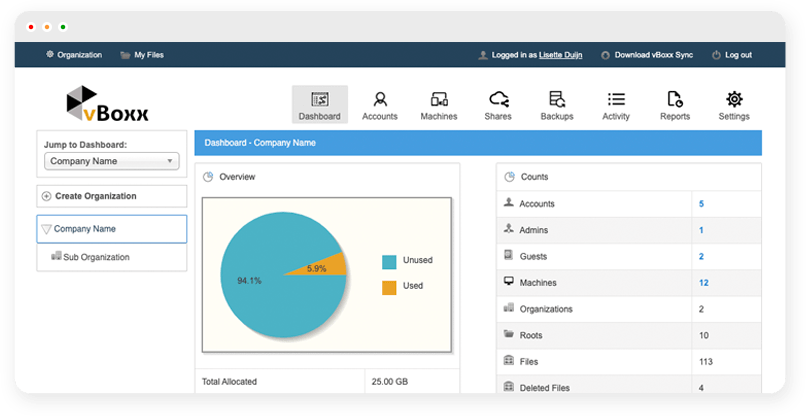 The vBoxxCloud dashboard offers a complete overview of the most important activity in the cloud.