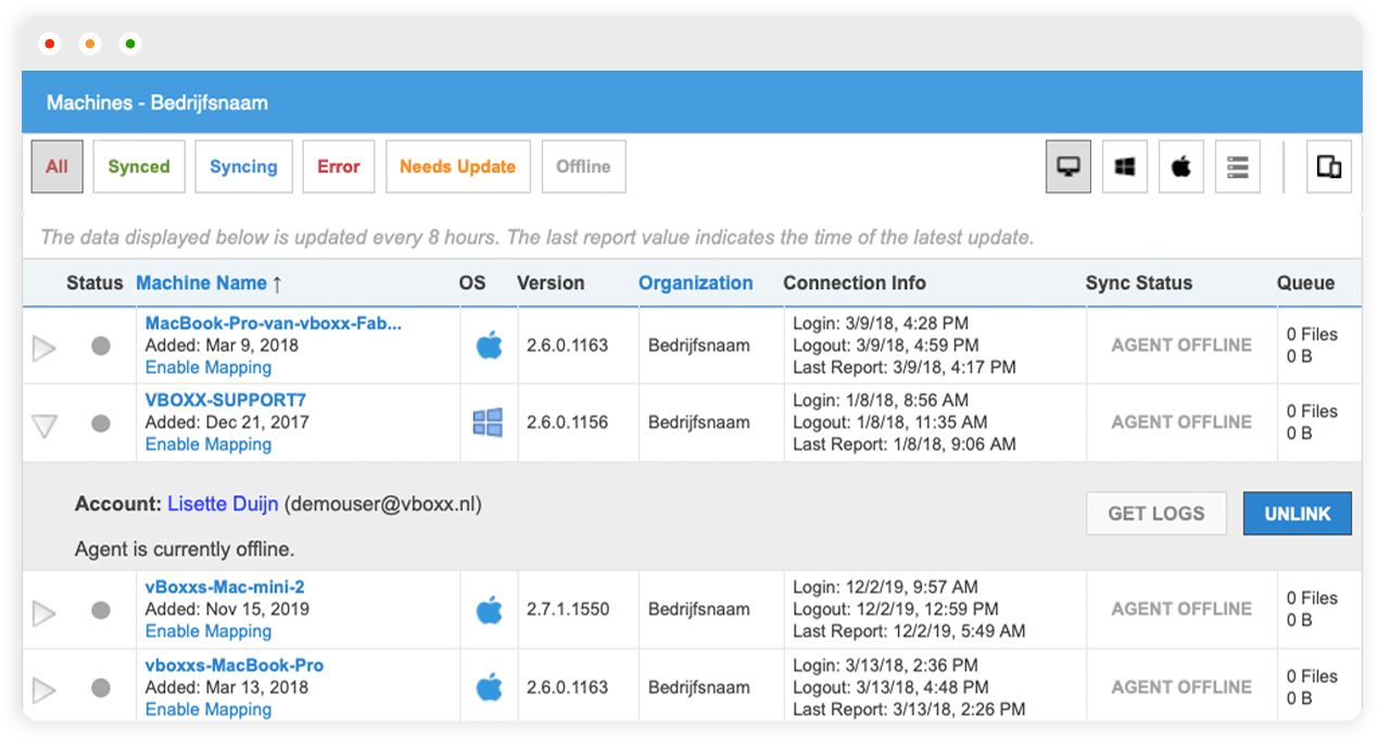 Whether it is a desktop, laptop, server or mobile, any device linked to the cloud can be monitored in the machine overview.