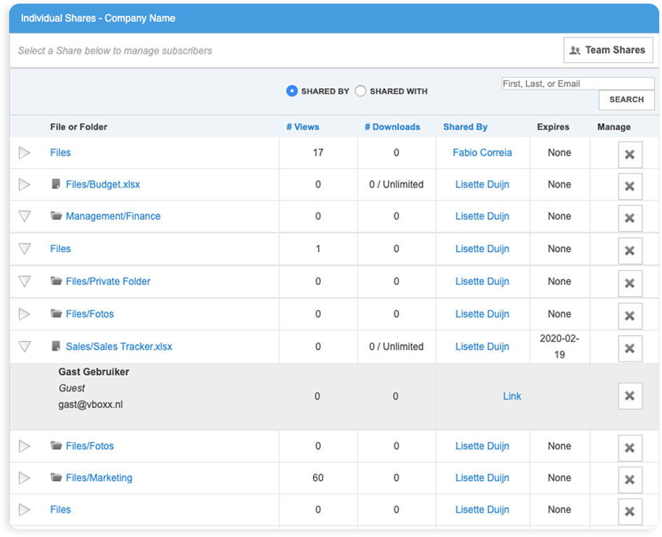 Monitor all vBoxxCloud files and folders shared via a secure link and free guest users.