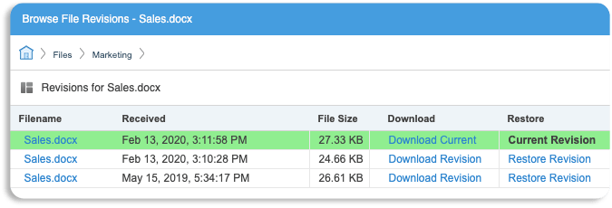You can also restore file revisions with a click of a button. Restored the wrong version? Simply revert it.